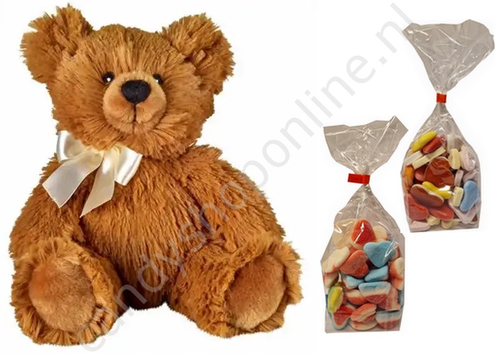 Bauer Pluche Beer Knuddel 25 cm. met blokzak 250gr. (gesuikerde) Hartenmix