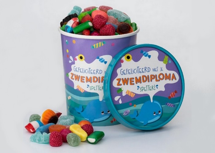 Lege Bucket € 2,49 Gevuld met 500gr. drop of 500gr. wijngummix en verpakt in cellofaan.