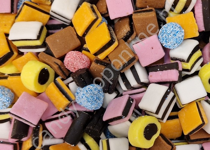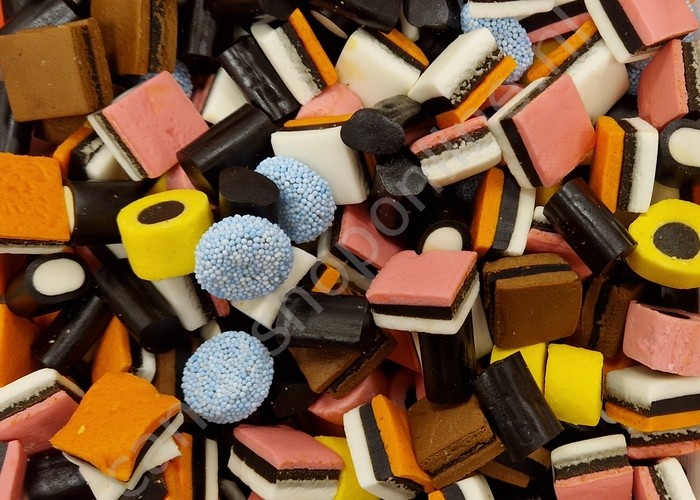 Ingrediënten: .suiker, glucosestroop, melado, tarwebloem, glucose-fructosestroop, geheel gehard kokosvet, kokosvlokken, zoethoutwortelextract, bevochtigingsmiddelen (sorbitol, glycerol), gelatine, tarwezetmeel, invertsuikerstroop, cacaopoeder, kleurstoffen (E150c, E153, E120, E160e, E160a), zout, emulgator (E471), natuurlijke aroma's (o.a. vanilline), plantaardige oliën (kokos, koolzaad), spirulinaconcentraat, glansmiddelen (carnaubawas, bijenwas), antioxidant (ascorbinezuur), kokosvet