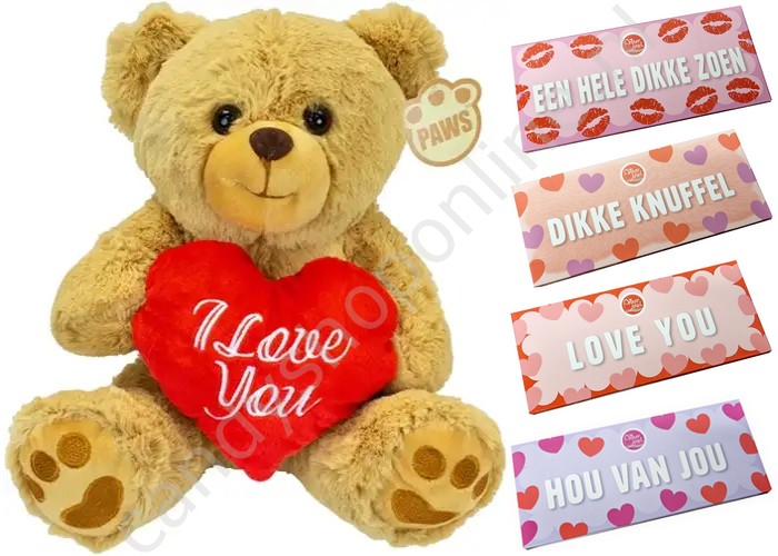 Pluche Beer Bruin met Hart 26 cm. met Voor Jou Chocolade Tablet