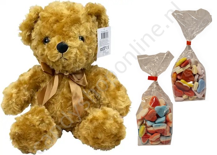Pluche Beer met Strik 40 cm. met blokzak 250gr. (gesuikerde) Hartenmix