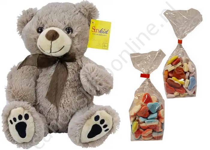 Sunkid Pluche Beer Grijs 25 cm. met blokzak 250gr. (gesuikerde) Hartenmix